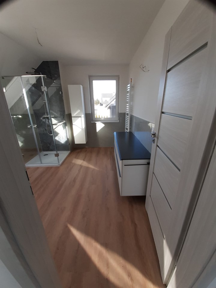 Otwarty, przestronny i dobrze doświetlony parter sprzyja rodzinnym i przyjacielskim spotkaniom. Z salonu możemy wyjść na taras i do ogrodu. Na pierwszym piętrze mamy rozplanowaną wygodną przestrzeń prywatną, z bardzo przestronną łazienką z oknem, trzema ustawnymi, wygodnymi sypialniami z rozległym widokiem z balkonów. Zarówno toaleta na parterze , jak i łazienka na piętrze zostały wykończone w najwyższym standardzie - meble niemieckiej marki Bernstein. Do domu zamówione są schody, można wybrać sobie opcję kolorystyczną, a zapłacona zaliczka pozostaje jako wartość dodana dla nowego właściciela. W garażu i pomieszczeniu gospodarczym są już wykończone podłogi. W domu zamontowane są już wszystkie drzwi wewnętrzne, osprzęt elektryczny (gniazdka i włączniki światła.